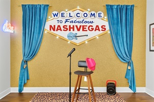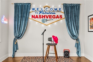 Karaoke nook with mic & mural backdrop
