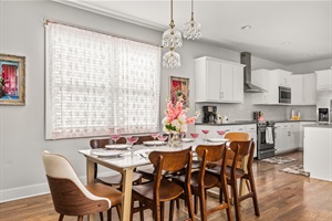 Fully stocked kitchen with island seating + dining table