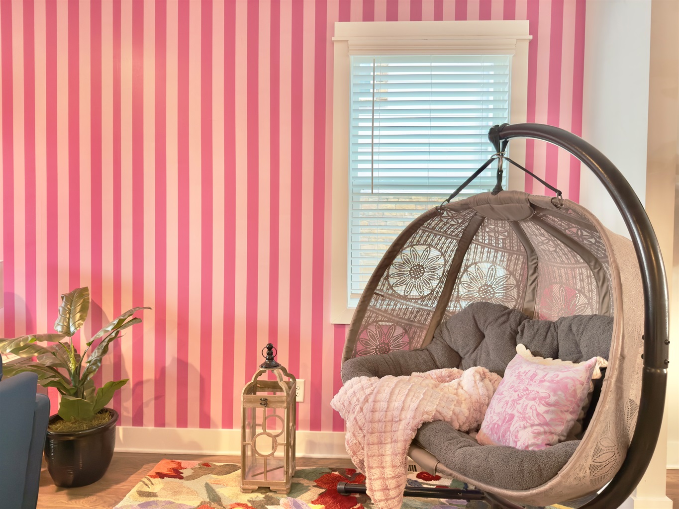 Spacious living room with sofas, throw blankets & hanging loveseat