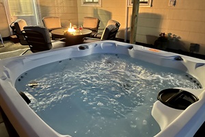 Back patio with hot tub + string lights
